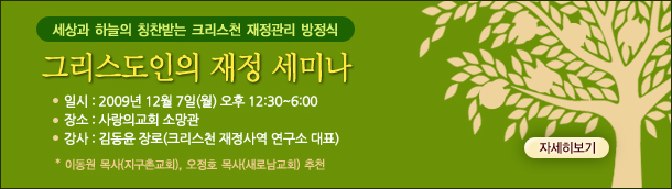이런 점에서, 이번에 국제제자훈련원에서 주관하여 개최하는 “그리스도인의 재정세미나(강사, 김동윤 장로)”는 보이지 않는 하나님보다 보이는 돈이 더 큰 매력으로 다가오는 현실 속에서 그리스도인들이 어떤 물질관을 가져야 하는가에 대한 바른 성경적 지혜를 제공할 것입니다. 이미 작년세미나를 통하여 참석자들로 하여금 재물에 대한 새로운 의미와 목적을 발견케 했으며, 하나님 앞에서 올바른 경제 활동으로 인한 신앙의 성장과 성숙을 경험한 바 있습니다.